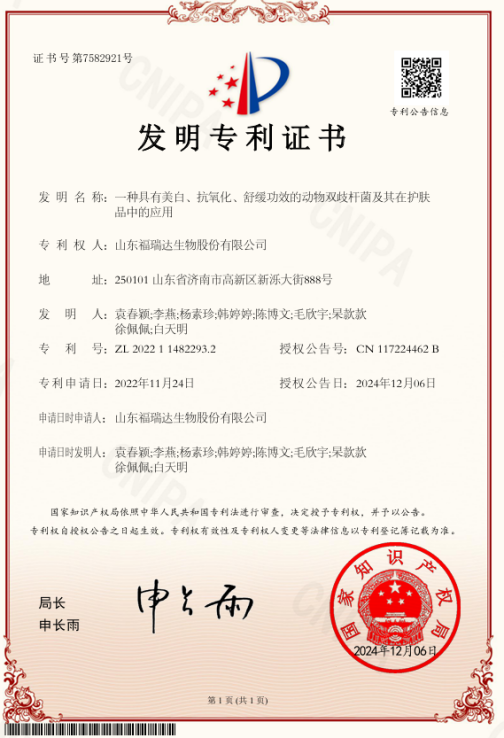 益修研:依托于福瑞達益生菌協(xié)同創(chuàng)新中心平臺,璦爾博士與山東大學聯(lián)合發(fā)現(xiàn)了一株人體來源的益生菌——動物雙歧桿菌W3(二裂酵母),并基于該菌株成功研發(fā)出兼具修護、美白、抗衰、抗氧化等多重功效的發(fā)酵濾液。并獲得兩項發(fā)明專利《一株動物雙歧桿菌及應用》、《一種具有美白、抗氧化、舒緩功效的動物雙歧桿菌及其在護膚品中的應用》。