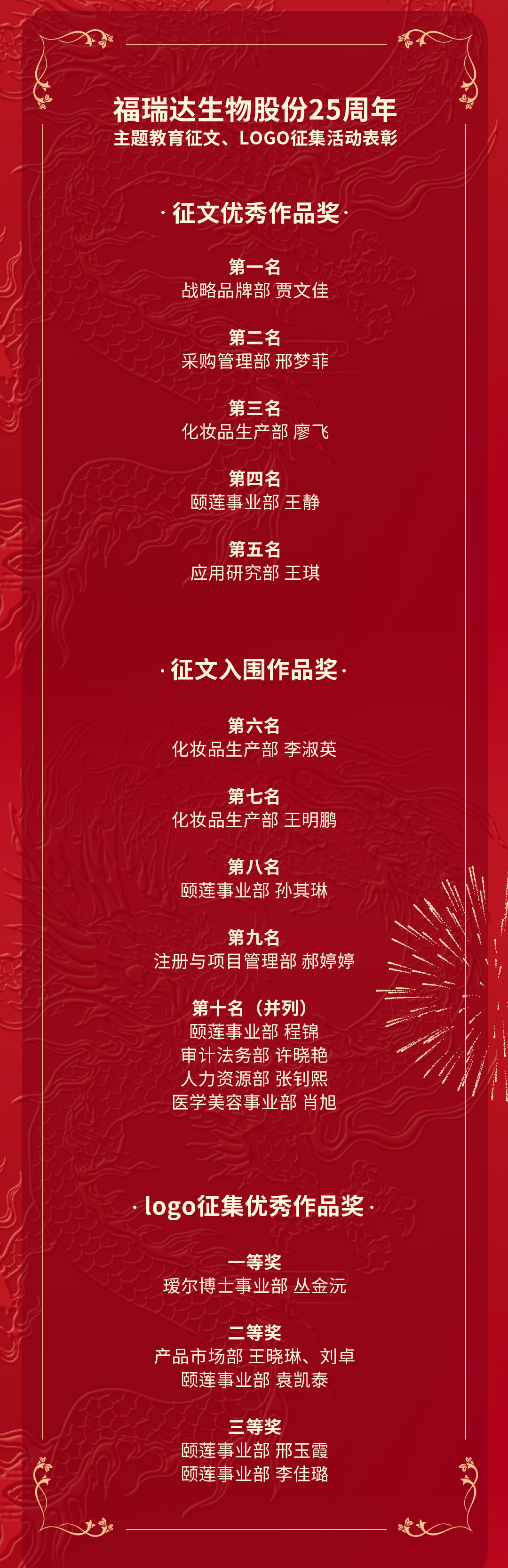2023年值福瑞達生物股份成立25周年之際,戰(zhàn)略品牌部聯(lián)合黨支部、人力資源部開展了主題教育征文、LOGO征集系列活動。本次活動自2023年7月開始,各部門員工熱情參與,帶來諸多原創(chuàng)新勢力。經(jīng)專業(yè)評委會評審評定,最終福瑞達生物股份25周年主題教育征文活動評出5份優(yōu)秀作品獎、5份入圍作品獎,LOGO征集活動評出6份優(yōu)秀作品獎。會上,對本次活動的獲獎?wù)哌M行了表彰。